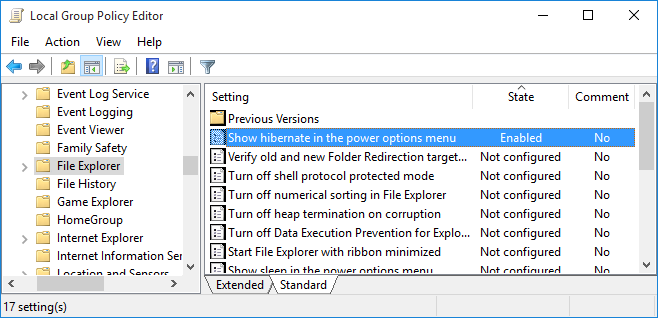 Computer Configuration -> Administrative Templates -> Windows Components -> File Explorer - 按兩下"在電源選項菜單中顯示休眠” 右側面板上的策略,並將其設置為啟用。