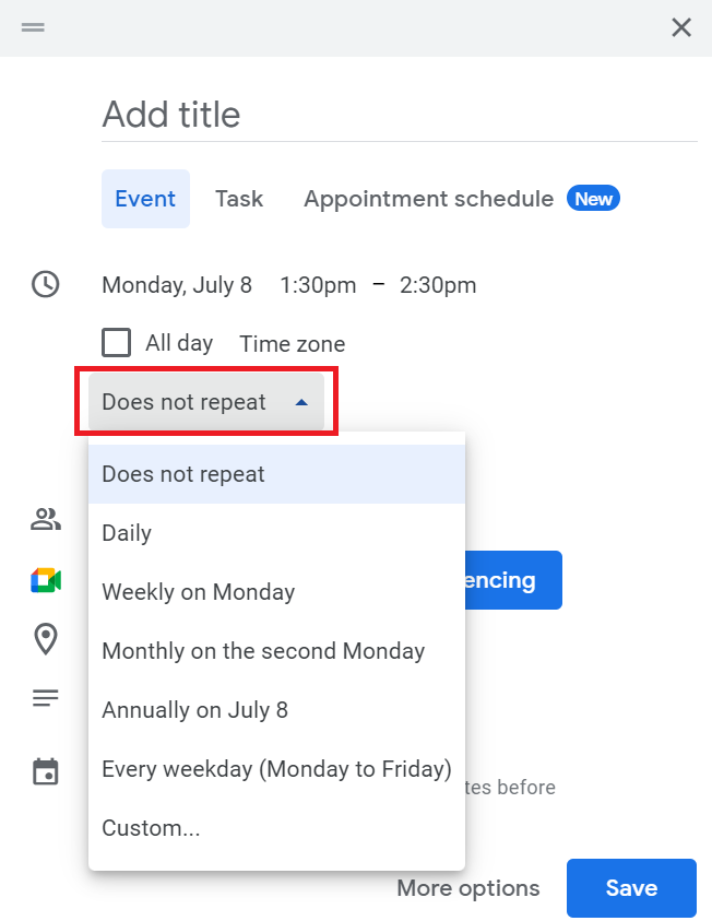 - 選擇重複:單擊“不重複”下拉列表,然後選擇適當的重複選項(每日、每週、每月等)。