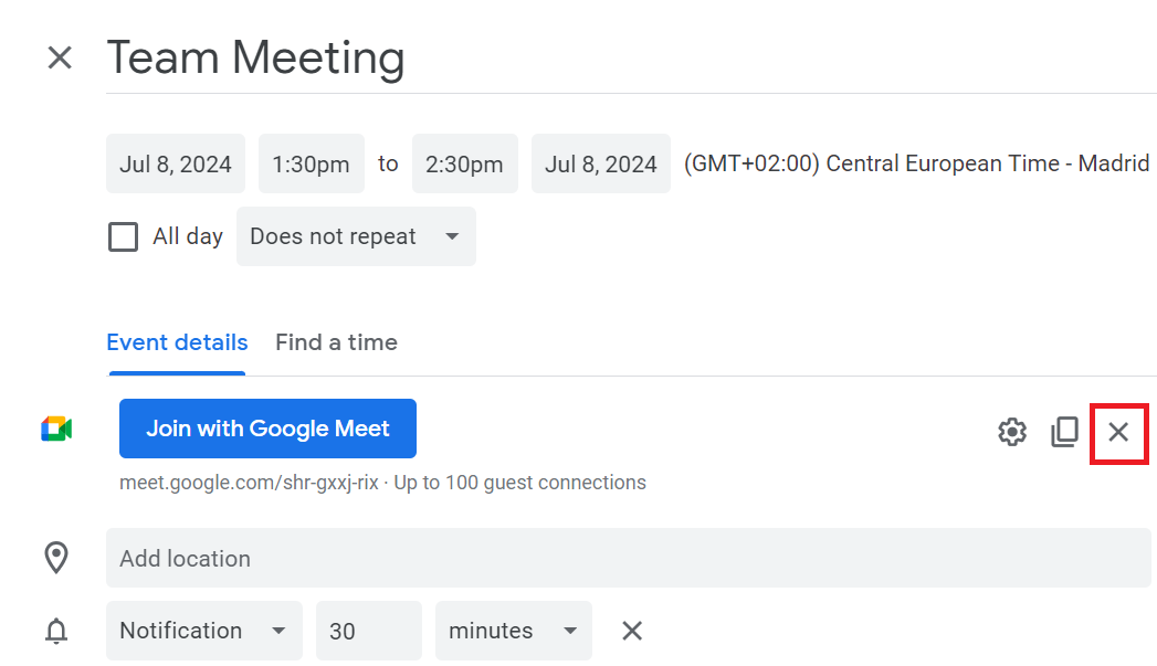 - 刪除現有的 Google Meet 鏈接:如果鏈接已存在,請單擊 Google Meet 鏈接旁邊的“刪除”按鈕。