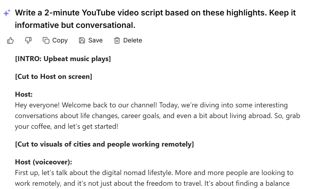 - “根據這些要點編寫一個 2 分鐘的 YouTube 視頻腳本。保持內容豐富但對話性強。”