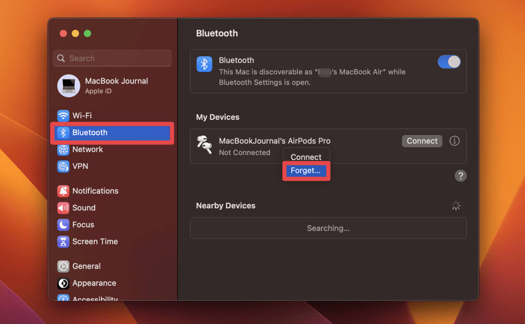 - 在藍牙設置窗口中,在設備列表中找到您的 Apple Magic Mouse 鼠標,右鍵單擊它,然後選擇忘記。