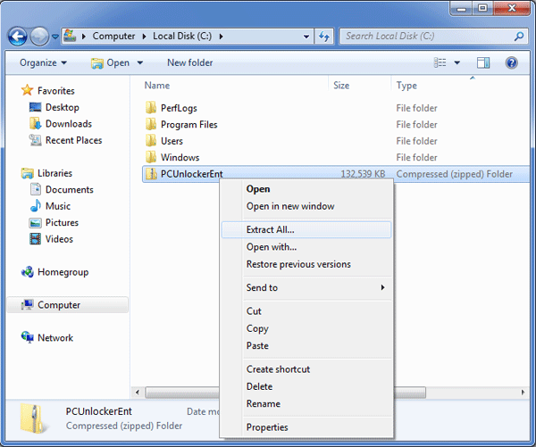 - 下載軟件後,右鍵單擊 PCUnlockerEnt.zip 文件。選擇全部提取從上下文菜單中。