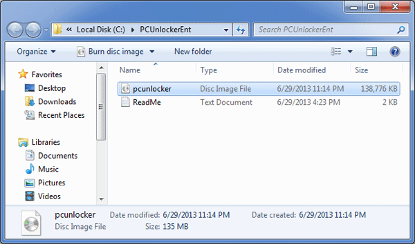 - 一段時間後,解壓縮的文件將出現在新窗口中。從下圖中,我們可以看到兩個文件:ReadMe.txt和pcunlocker.iso。默認情況下,Windows 不會顯示文件擴展名。要修復它,請參閱這篇文章:如何在 Windows 8/7/Vista/XP 中顯示文件擴展名。
