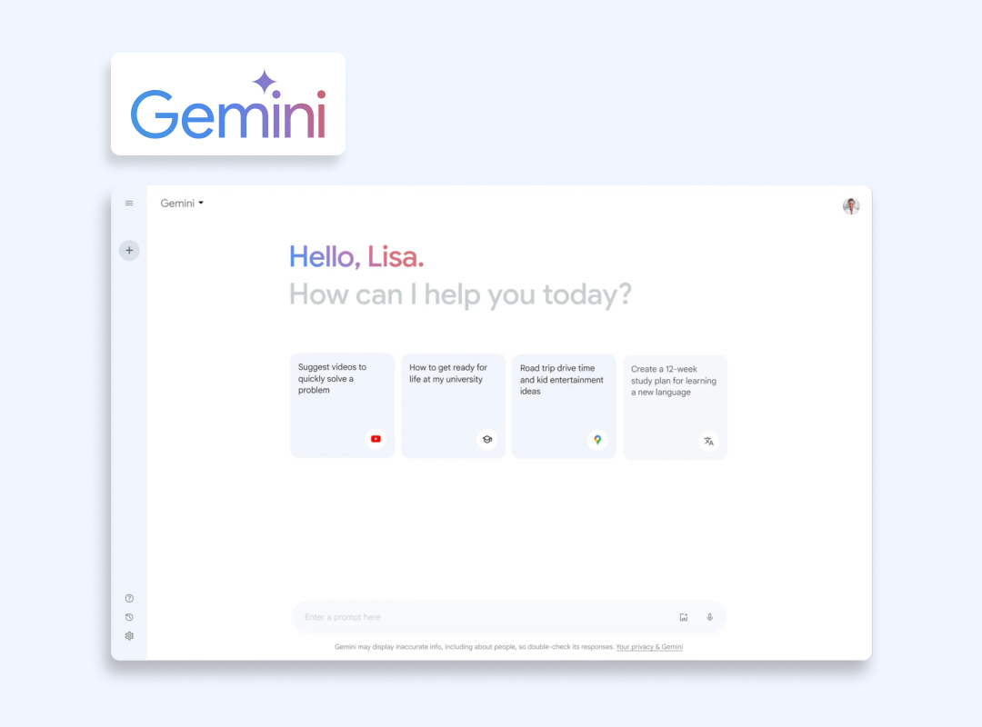 Gemini 是谷歌強大的人工智能平台。主要優點是它的設計速度快且功能強大。用戶分享它可以比 ChatGPT 更快地給出複雜問題的答案。另一個優勢是 Gemini 已集成到所有 Google Workspace 應用(Docs、Meet 等)中。