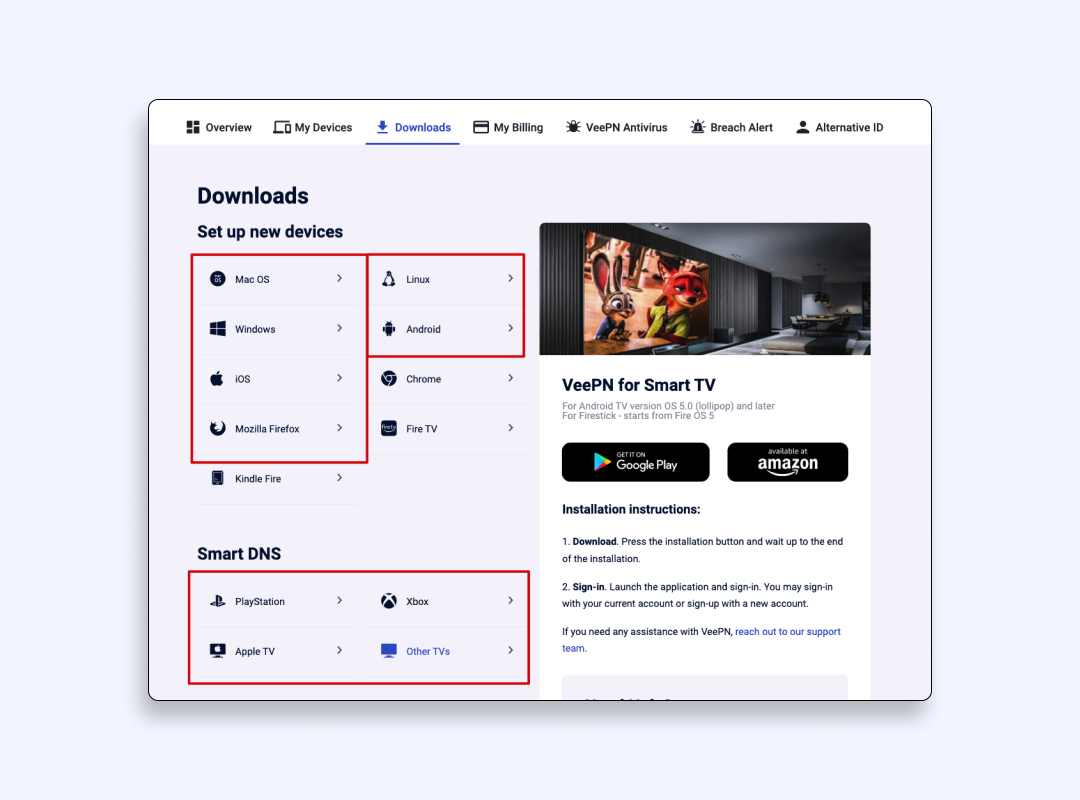 - 選擇您的設備並下載 VeePN:macOS、Windows、Linux、Android、Fire TV、Apple TV、Playstation、Xbox、路由器等。