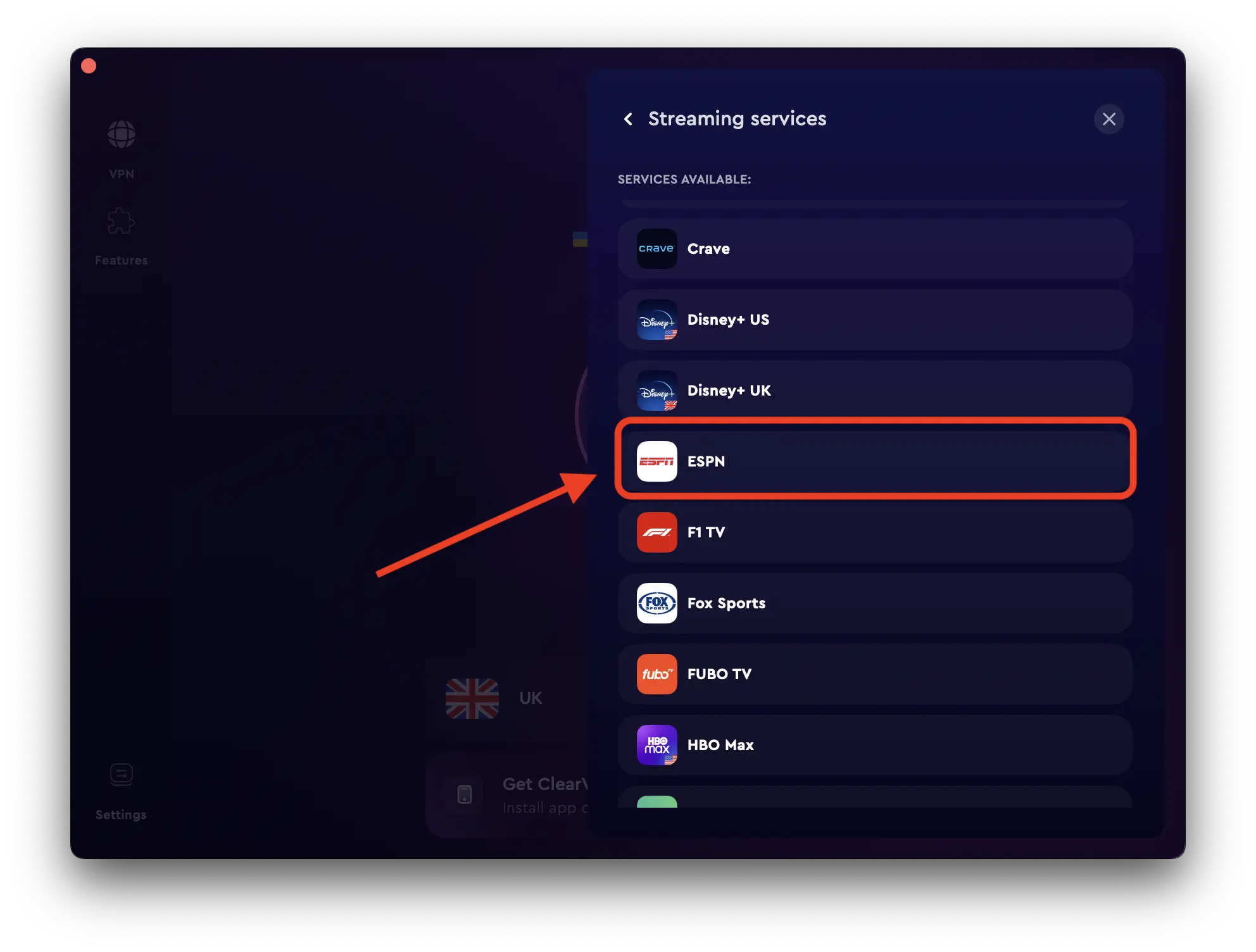 ClearVPN 是在網站和應用程序上流式傳輸體育內容的人群的最愛。它採用個性化快捷方式構建,讓您可以從世界任何地方觀看您最喜愛的體育賽事。以下是如何執行此操作: