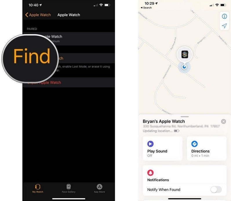 - 點擊被盜手錶旁邊的“信息”圖標,然後選擇“查找我的 Apple Watch”。