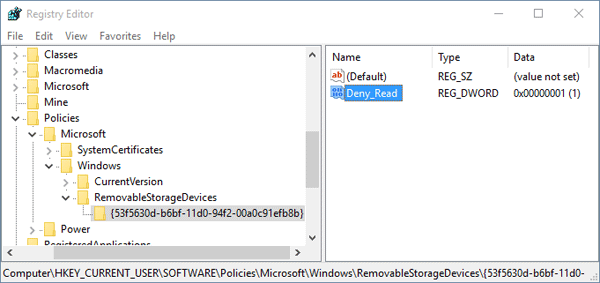 {53f5630d-b6bf-11d0-94f2-00a0c91efb8b}是通用 USB 存儲設備的 GUID。如果要阻止 CD/DVD 訪問,請鍵入 GUID{53f56308-b6bf-11d0-94f2-00a0c91efb8b}反而。