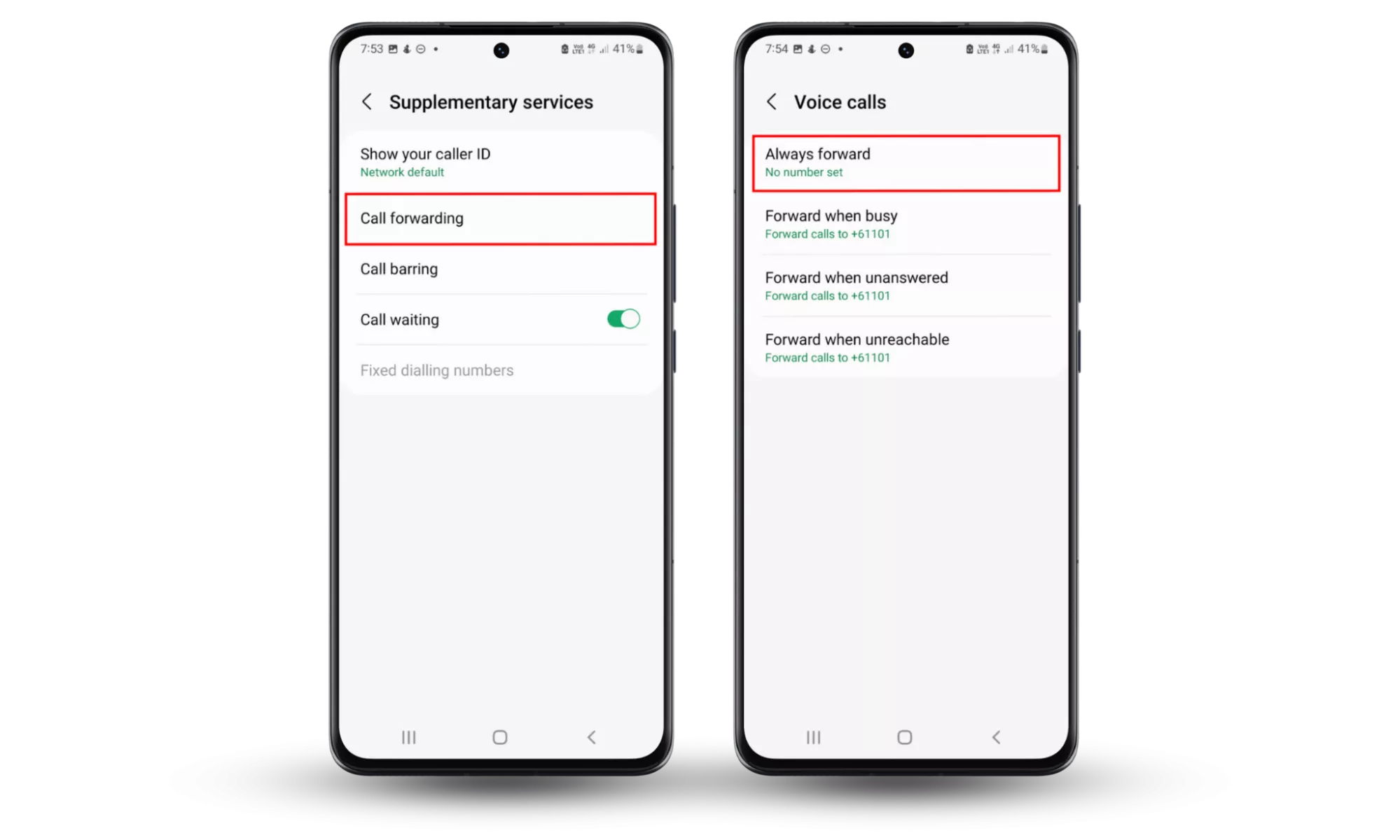 步驟 3-5:選擇補充服務 > 呼叫轉移 > 確保未設置號碼。