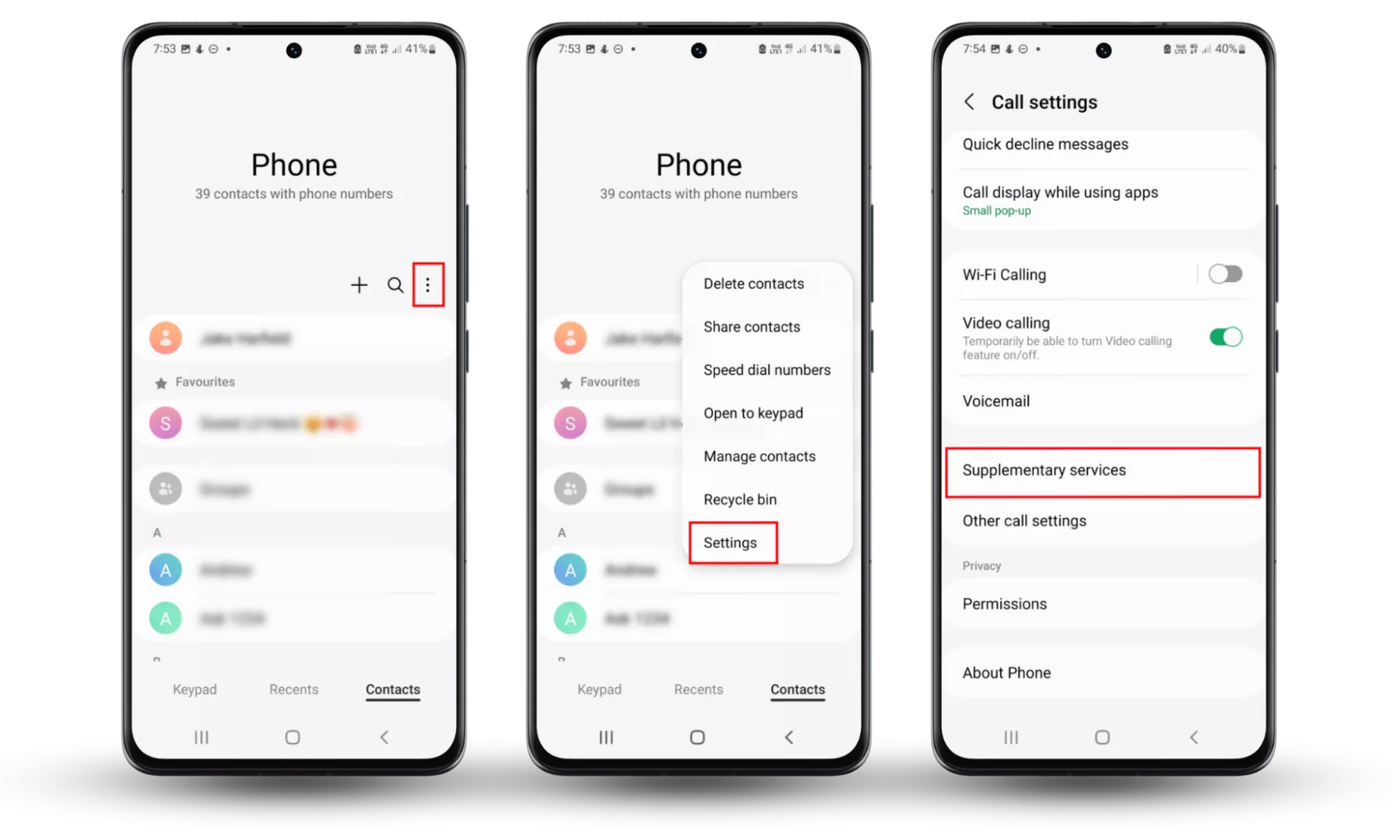 步驟 1-2:選擇電話應用 > 三個點 > 設置。