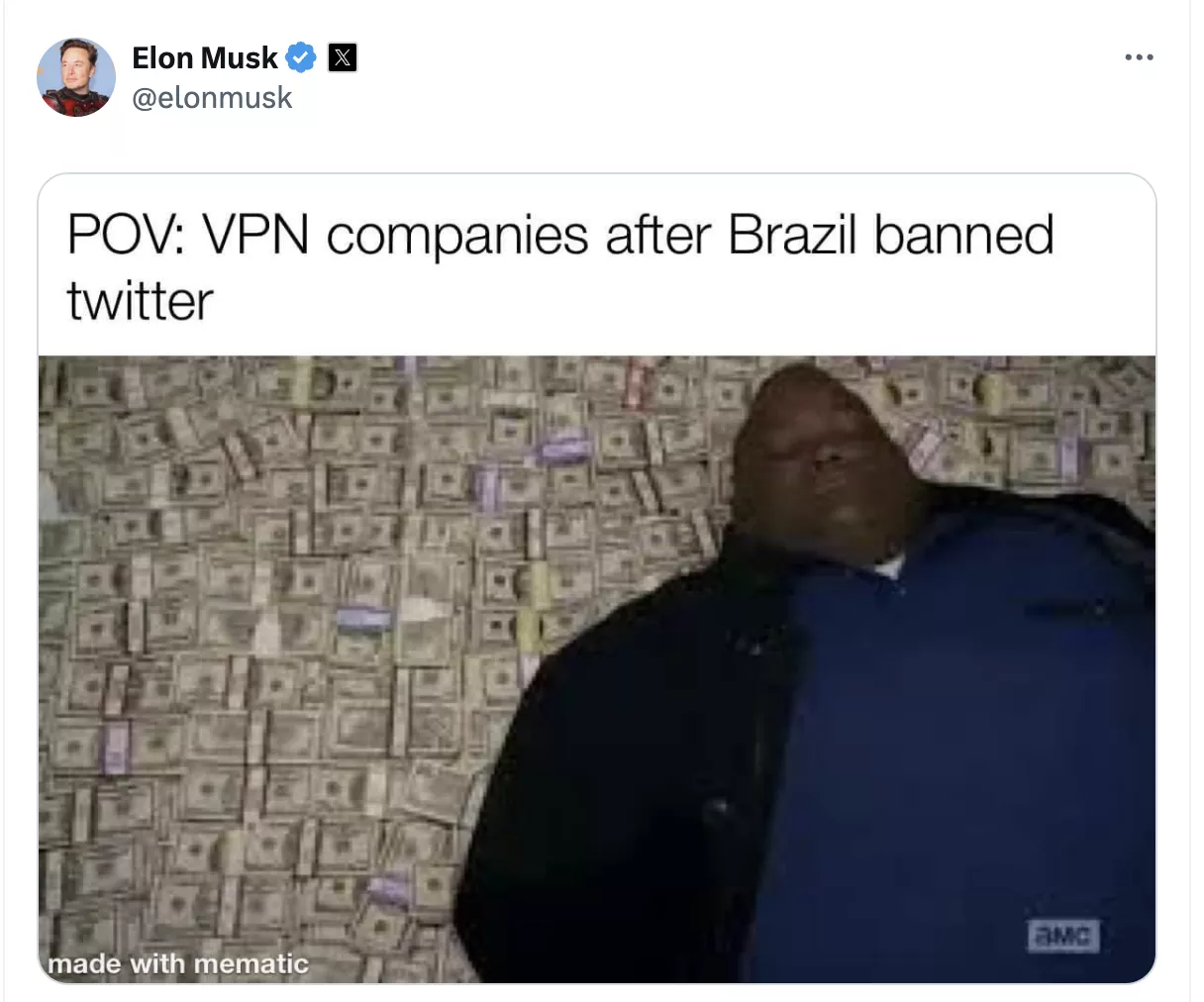 至於巴西人使用X,《印度時報》報告社區反對禁令,並通過發布“無論他們嘗試多少,都不會壓制信息”信息來分享馬斯克的立場,這僅意味著X必須在互聯網上保留言論自由之島,在互聯網上,想法就可以在沒有任何障礙的情況下交換。