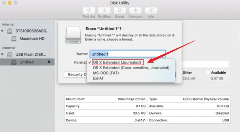格式化 USB 驅動器:在 macOS 上打開“磁盤工具”。選擇您的 USB 驅動器並將其格式化為Mac OS 擴展(日誌式)帶有 GUID 分區圖。