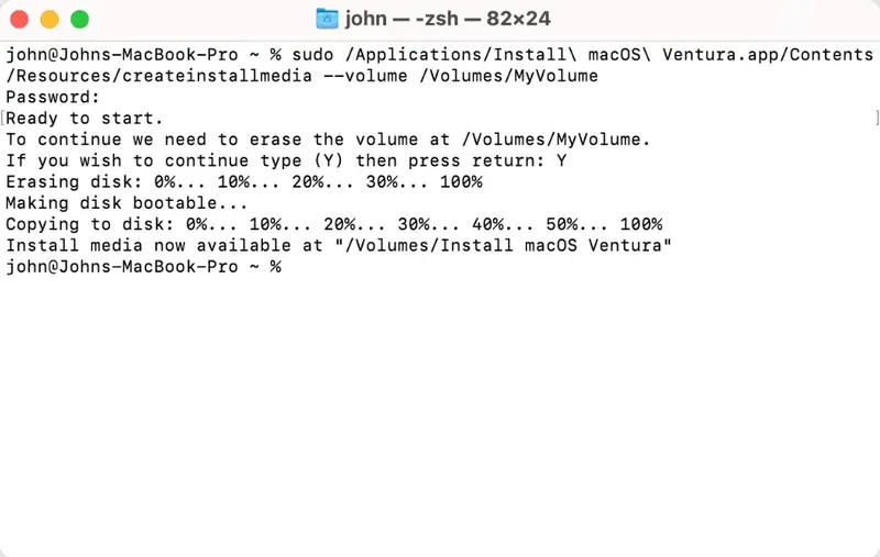 sudo /Applications/Install macOS Ventura.app/Contents/Resources/createinstallmedia --volume /Volumes/MyVolume