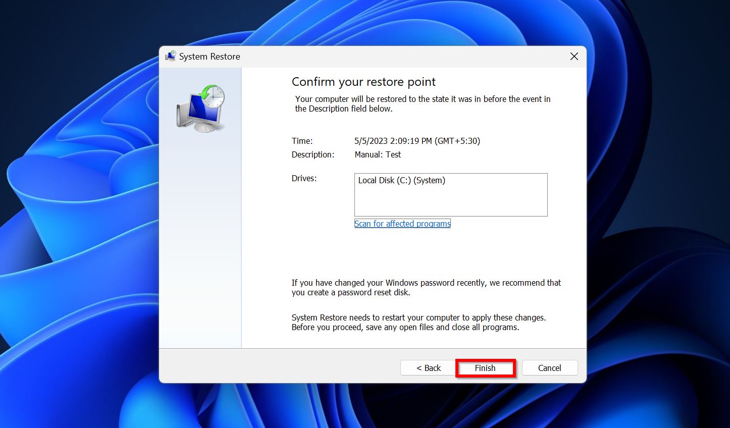 - 仔細檢查所有信息並單擊結束開始系統還原過程。