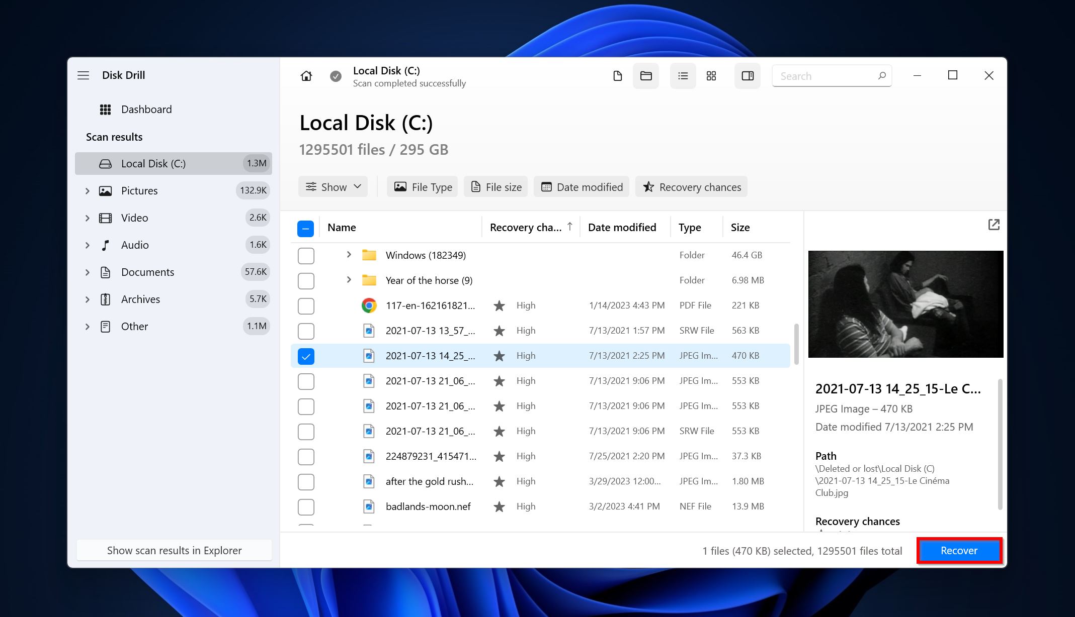 - 使用複選框選擇您想要恢復的文件。您可以直接使用搜索框搜索文件或文件類型,也可以使用過濾器選項。 Disk Drill 還會顯示當前所選文件的預覽。點擊恢復確認您的選擇後。