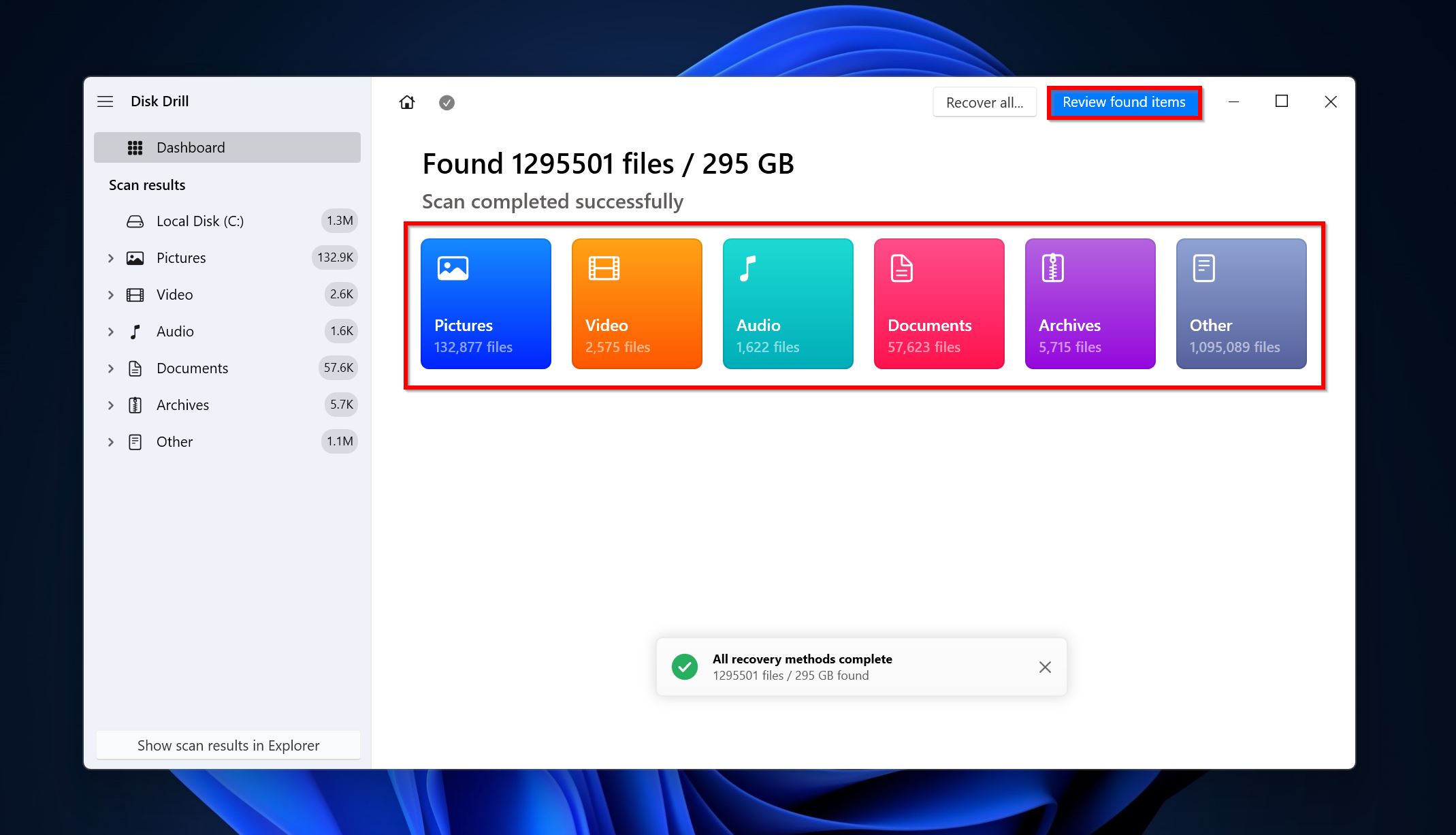 - 點擊查看找到的項目查看 Disk Drill 已發現的文件。您可以通過單擊相關文件類型(圖片、視頻、音頻、文檔、檔案和其他)來選擇過濾結果。