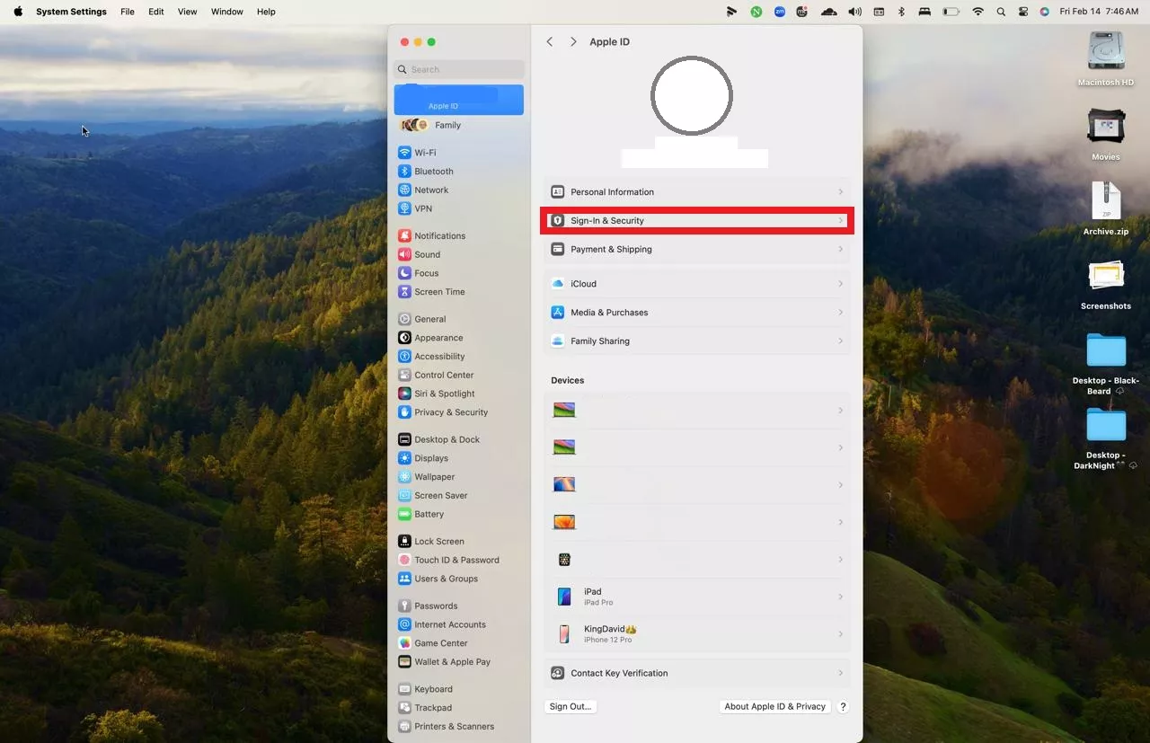 步驟 1-2:打開系統設置 > 轉至 Apple ID > 登錄和安全。
