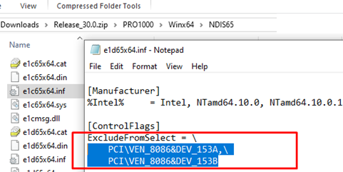 如果您需要在 Windows Server 2016 中安裝以太網連接 I217-V 適配器的網絡驅動程序,請轉至Release_30.0.zipPRO1000Winx64NDIS65文件夾並打開e1c65x64.inf文件在文本編輯器中。如您所見,從選擇中排除參數選項包含應忽略的設備 ID。這些 VEN 和 DEV ID 與我的網絡適配器匹配。清除內容[ControlFlags]部分。