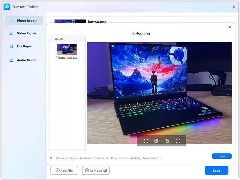 6. 您可以直接在軟件界面中預覽修復後的 PNG,然後單擊“保存”將文件保存在計算機上您的首選位置。保存後,您應該能夠毫無問題地打開 PNG 文件。