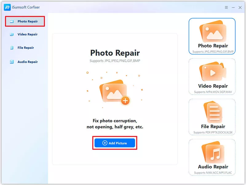 2. 在iSoft Corfixer的主界面上,選擇屏幕左上角的照片修復選項。