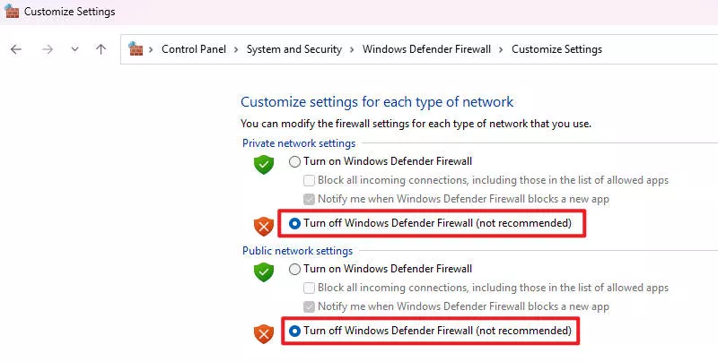 2. 關閉 Windows 防火牆:轉至控制面板 > 系統和安全 > Windows Defender 防火牆,然後單擊打開或關閉 Windows 防火牆。暫時關閉防火牆以查看 PNG 文件是否打開。