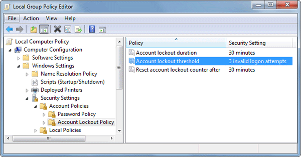 在本地安全策略編輯器的左窗格中,展開賬戶政策然後單擊賬戶鎖定政策。在右側窗格中,您可以看到三個策略設置。雙擊該策略,您可以將設置更改為所需的值。