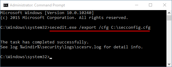 - 鍵入以下命令並按 Enter 鍵。這會將本地安全策略的所有設置導出到文本文件。