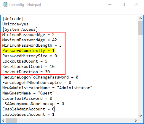 - 用記事本打開C:\secconfig.cfg文件,您可以根據自己的目的查看和修改策略。例如,如果您想要禁用密碼複雜性要求策略,只需將值PasswordComplexity 設置為0 並保存更改即可。