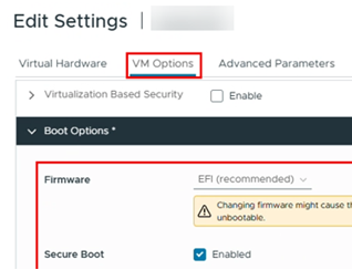 如果這是 VMware 虛擬機,請轉到 VM 設置,將啟動選項更改為電噴固件模式,並啟用安全啟動選項。