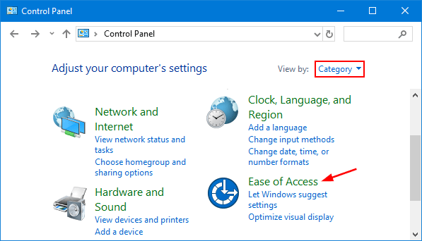 打開控制面板類別查看,然後單擊輕鬆訪問。