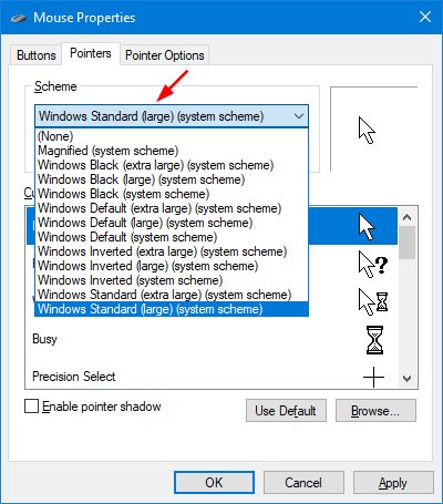 當“鼠標屬性”窗口打開時,選擇指針選項卡。從下拉框中選擇鼠標指針方案。點擊申請進而好的。
