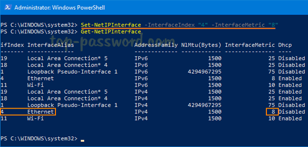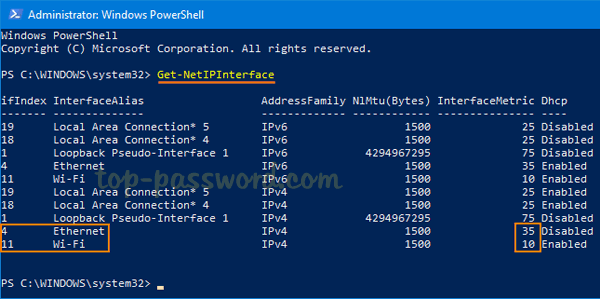 ifIndex 列列出了每個適配器的唯一編號,而 InterfaceMetric 列則列出了適配器的優先級。從上面的截圖中可以看出,Wi-Fi 的連接優先級高於以太網。