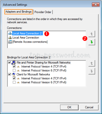 - 單擊適配器和綁定選項卡。在“連接”下,您會注意到“本地連接 2”具有最高優先級。您可以使用右側的向上或向下箭頭按鈕來更改優先級。