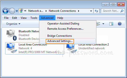 - 您應該會看到網絡適配器列表。按替代按鈕(如果菜單欄尚未可見)並單擊先進的菜單,然後選擇進階設定。