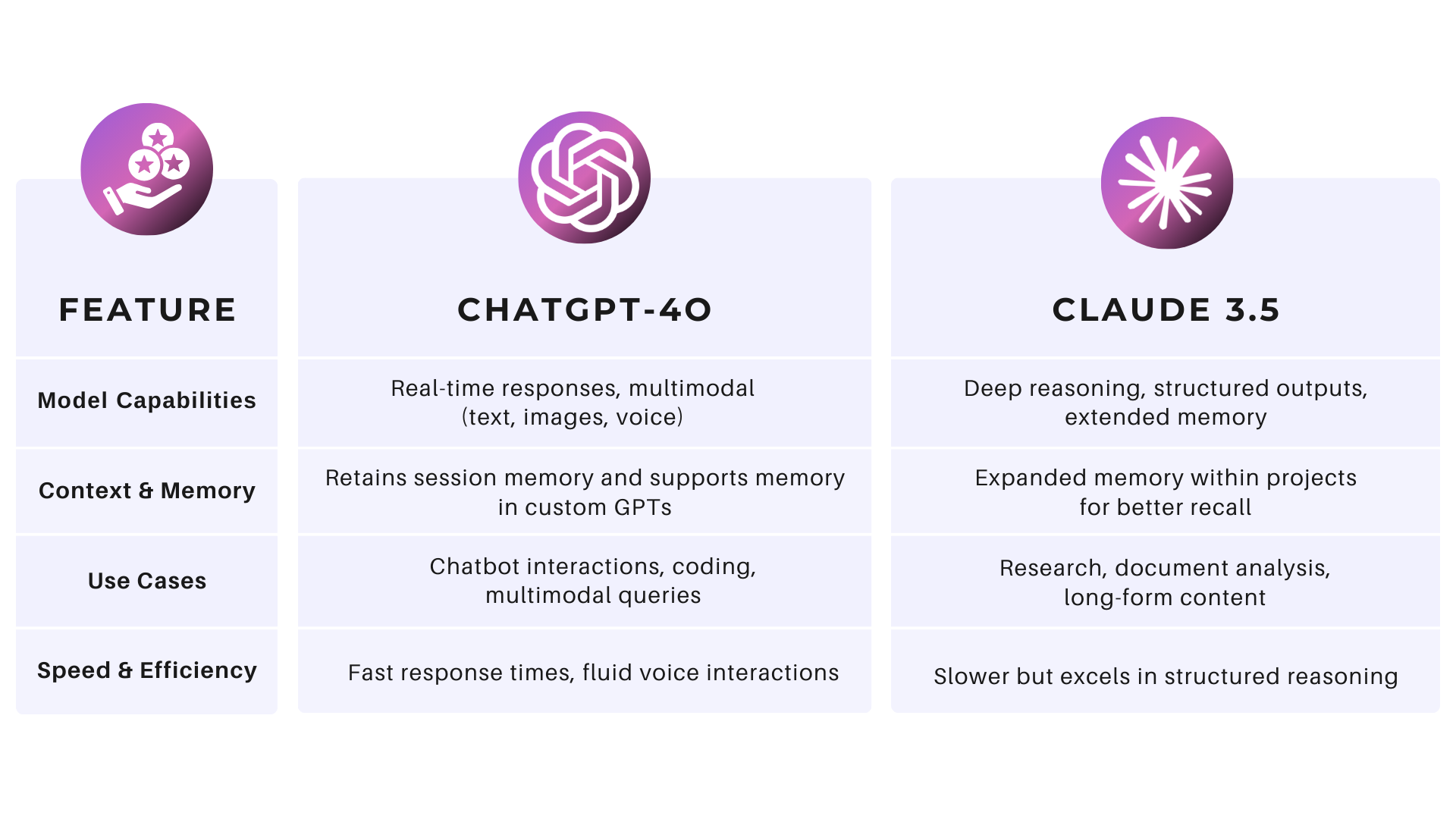 - 背景和記憶→ 兩種模型都保留上下文,但方式不同。 ChatGPT-4o 具有會話內存並支持自定義 GPT 中的內存,而 Claude 3.5 在項目內提供擴展內存,從而可以更好地回憶交互過程。