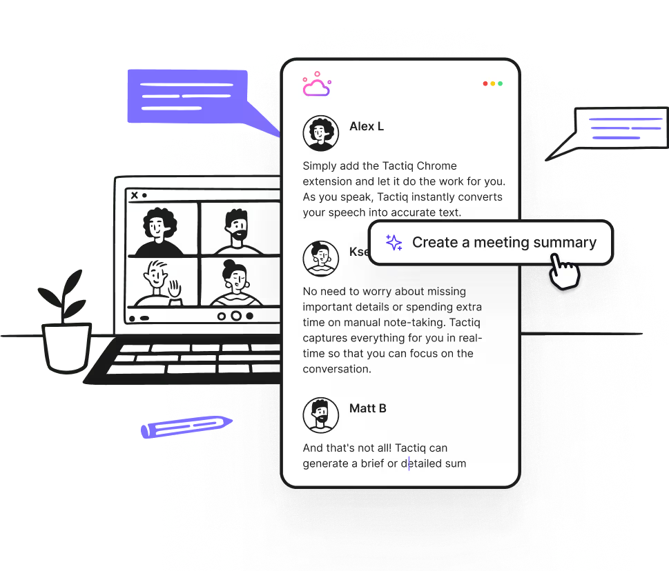 Taactiq 捕捉到了這些時刻。它可與 Zoom、Google Meet 和 Microsoft Teams 等流行視頻會議平台配合使用,在會議發生時提供實時轉錄。通話結束後,您將獲得完整的、可搜索的文字記錄,其中包含人工智能生成的即時摘要和操作項。