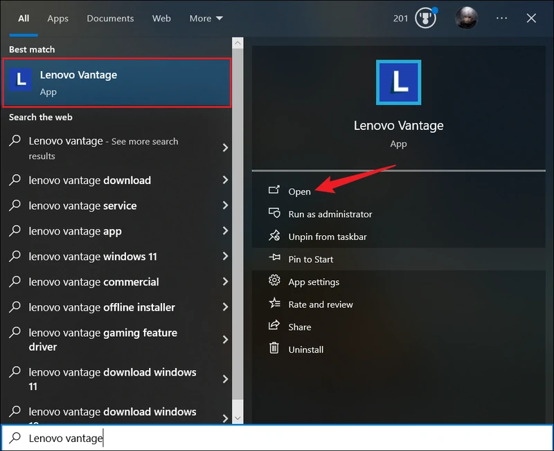 第 1 步:在搜索框中輸入筆記本電腦管理器的名稱,打開筆記本電腦管理器。下面的示例使用 Lenovo Vantage。