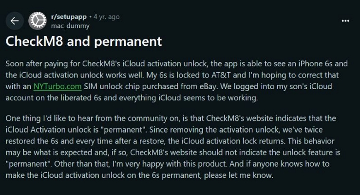 許多用戶,尤其是 Reddit 上的用戶,在發現該工具無法在重置後倖存後指出了這一點。因此,了解這一點很重要:Checkm8 提供臨時解鎖,但不能永久刪除 iCloud Lock。