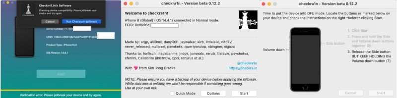 - 如果您使用的是 5S 到 X 的 iPhone,或者運行 A5 到 A11 芯片的 iPad,該工具首先需要越獄,然後才能確認資格。只需運行程序中內置的 Checkra1n 越獄實用程序即可。
