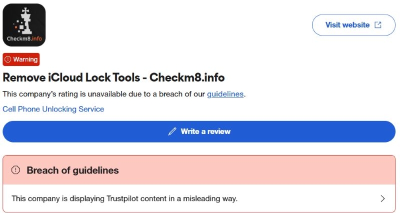 Checkm8也是罕見的帶有Trustpilot標記的iCloud解鎖工具警告:潛在違反準則的紅色標籤。這些通常是在公司操縱或歪曲評論時分配的。