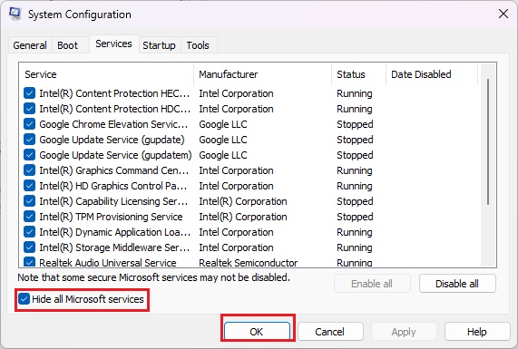- 前往服務選項卡 > 啟用隱藏所有 Microsoft 服務複選框。