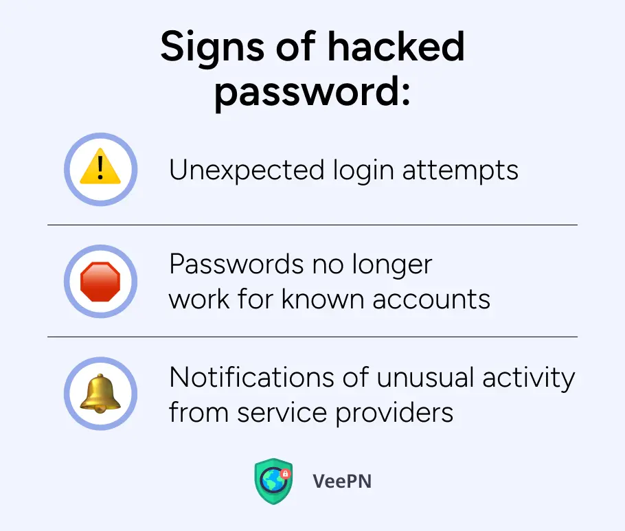 黑客通過數據洩露竊取您的密碼或通過網絡釣魚欺騙您後,他們可以立即訪問您的個人信息。現在,您需要更新當前密碼並開啟更安全的登錄驗證以確保您的信息安全。如果您希望在您的密碼出現在被黑客入侵的數據庫中時收到通知,請註冊 VeePN違規警報保安服務。