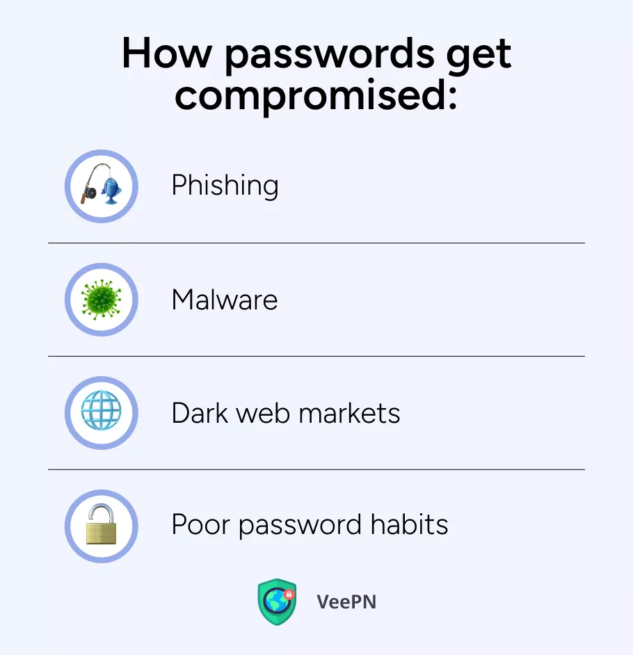 密碼洩露是通過網絡釣魚或其他類型的攻擊在數據洩露中被盜的密碼。這些密碼非常容易受到攻擊,網絡犯罪分子可以使用它們來進入您的帳戶。