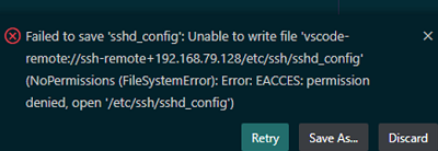 Failed to save 'sshd_config': Unable to write file 'vscode-remote://ssh-remote+192.168.79.128/etc/ssh/sshd_config' (NoPermissions (FileSystemError): Error: EACCES: permission denied, open '/etc/ssh/sshd_config').