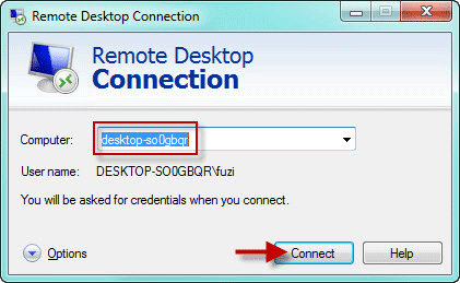 2. 鍵入要連接的遠程計算機的計算機名稱,然後單擊連接。計算機名稱不區分大小寫。
