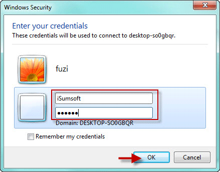 3. 輸入遠程計算機的用戶名和密碼,然後單擊好的。