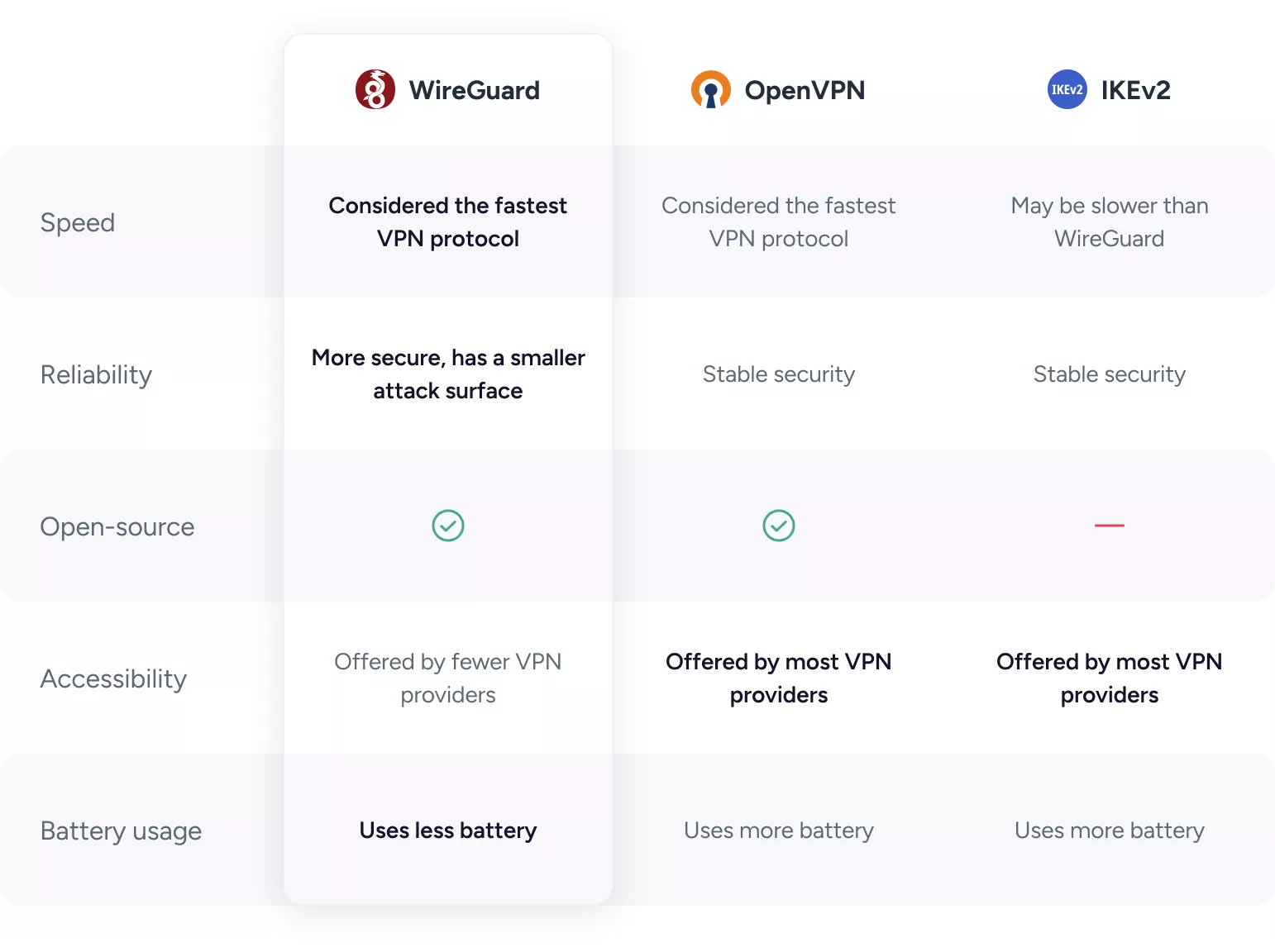 WineGuard和OpenVPN都是具有自己優勢和劣勢的安全VPN協議。 WireGuard更新了,並且以其更快的速度和簡化的代碼庫而廣受歡迎,而OpenVPN以其靈活性和強大的安全功能而聞名。在此博客文章中找到他們的比較。
