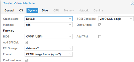 添加EFI盤:使能夠。選擇 EFI 磁盤的存儲。將磁盤類型保留為默認值,qcow2