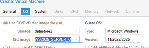 3. 作業系統選項卡,選擇來賓操作系統類型(微軟 Windows 11/2022/2025)以及上傳到 Proxmox 存儲的 Windows 安裝 ISO 映像。