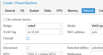 10. 網絡選項卡,選擇VirtIO(半虛擬化)虛擬網卡型號而不是Intel E1000。選擇要通過其公開 VM 的網橋。在這個例子中,虛擬機BR0連接到 Proxmox 主機的物理網絡接口。
